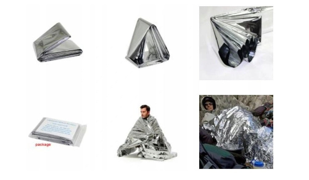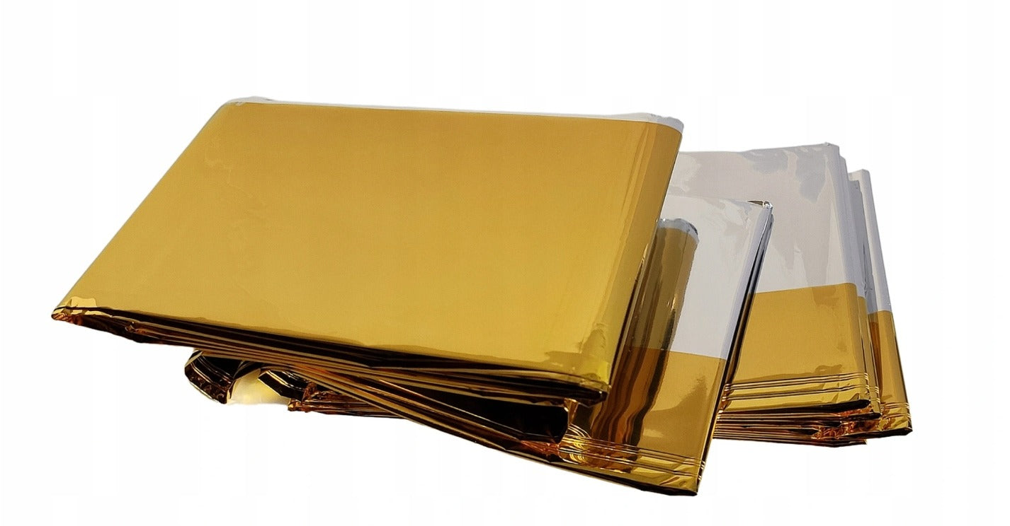 ▪ Avarinė antklodė pagaminta iš sidabro ir aukso spalvos metalizuotos PE folijos.