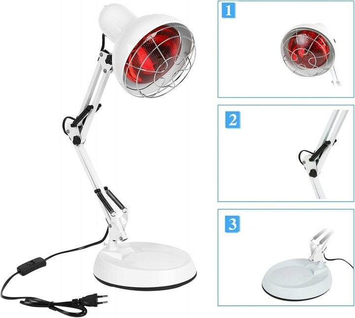 Terapinė šildanti lempa, veikianti infraraudonųjų spindulių principu – idealiai tinka skausmo malšinimui, raumenų atpalaidavimui bei sveikatos stiprinimui. Stabili konstrukcija su reguliuojamu kampu leidžia pritaikyti šilumą tiksliai ten, kur jos reikia.