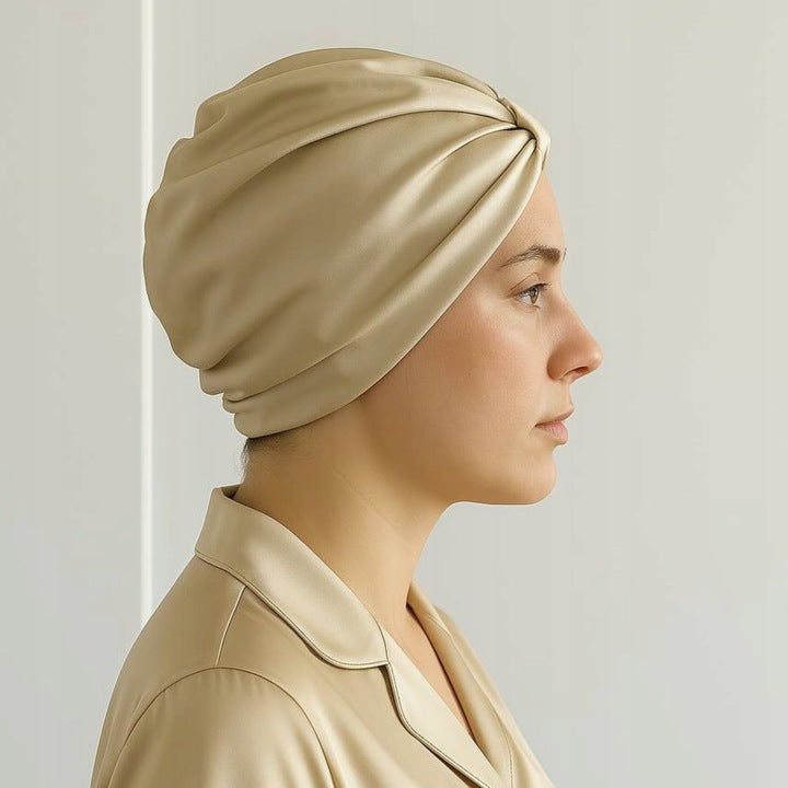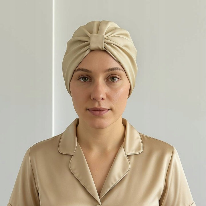 Šilkinė turbaninė plaukų kepuraitė iš 100 % natūralaus šilkmedžio šilko –šampano spalvos